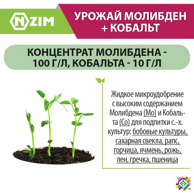 Мікродобриво Молібден+Кобальт Мікродобриво Молібден+Кобальт містить високу концентрацію молібдену (Mo) та кобальту (Co) у легкодоступній формі для позакореневого підживлення сільськогосподарських культур. Молібден та кобальт є важливими мікроелементами, необхідними для забезпечення оптимального рос...