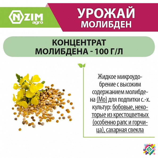 Молібден Молібден - рідке мікродобриво з високим вмістом молібдену (Mo) у легкодоступній формі, призначене для позакореневого підживлення сільськогосподарських культур. Молібден відіграє ключову роль у фіксації азоту та інших біохімічних процесах рослин, тому його відсутність може суттєво вплинути ...