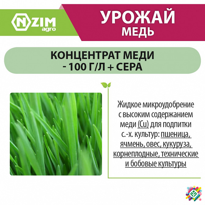 Мідь Мідь є рідким мікродобривом з високим вмістом міді (Cu) в легкодоступній формі для позакореневого підживлення сільськогосподарських культур. Це добриво рекомендується для корекції живлення культур, які є чутливими до нестачі міді та сірки, таких як пшениця, ячмінь, овес, кукурудза, коренеплідн...