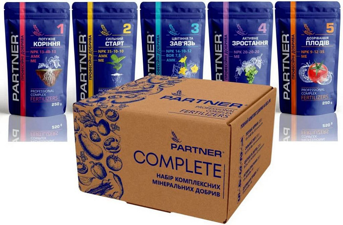 https://partner-pf.ua.market/ Набір включає 5 видів послідовних у використанні комплексів: 1) Потужне Коріння Комплексне добриво з високим вмістом фосфору сприяє розвитку сильної кореневої системи, швидкому та якісному укоріненню розсади, забезпечує старт рослин, які перезимували. АМК забезпечуют...