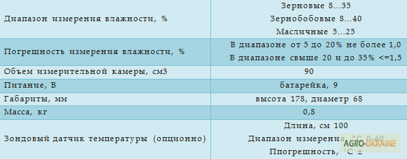 Пристрій призначений для оперативного вимірювання вологості зернових, бобових культур, насіння та продуктів їх переробки в умовах збирання, післязбиральної обробки, сушіння, зберігання та переробки. Волагомір дозволяє вимірювати вологість у 12 культурах, таких як: пшениця, ячмінь, кукурудза, соя, ра...