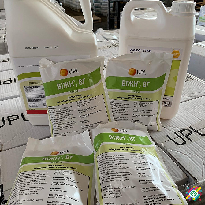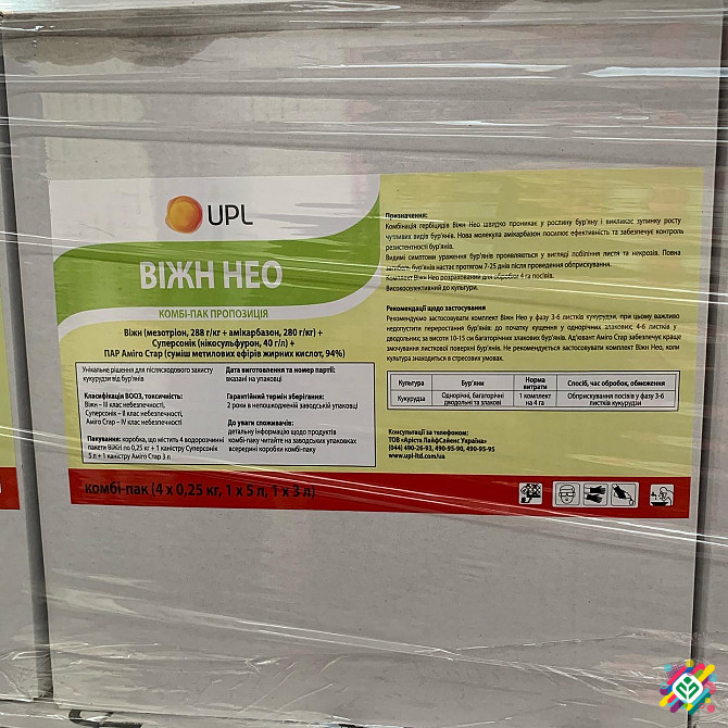 **Унікальне рішення для післясходового захисту кукурудзи від бур'янів: комплект Віжн Нео** **Опис продукту:** Комплект Віжн Нео призначений для ефективного захисту посівів кукурудзи площею 4 гектари від бур'янів. Цей комплект містить такі діючі речовини: Віжн (мезотріон, 288 г/кг + амікарбазон, 280...