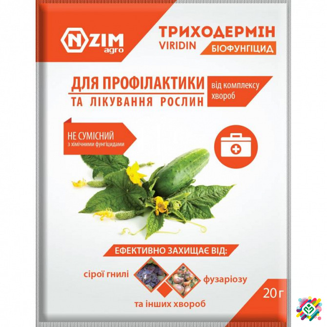 Мінімальна сума замовлення - 350 грн Триходермін (Віридін) 20г - біологічний фунгіцид, призначений для захисту всіх видів огородніх та садових культур від широкого спектра грибкових та бактеріальних захворювань рослин. Приготування робочого розчину: Змішати вміст пакетика 20г в 0,5л теплої до 40°C...