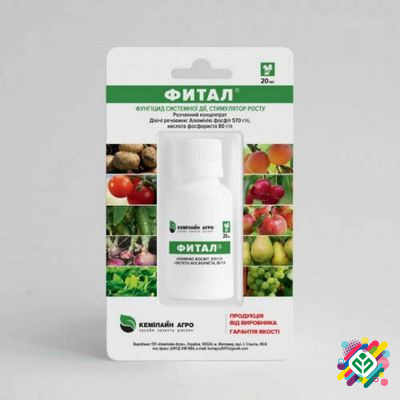 Мінімальна сума замовлення - 350 грн. Упаковка: 20 мл, 1 л. Високоякісний фунгіцид "Фітал" призначений для використання на винограді, плодових, ягідних та овочевих культурах для лікування та профілактики грибкових захворювань. Препарат має стимулюючі властивості, збільшує стійкість рослин до негати...