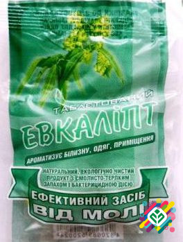 Таблетки від молі "Евкаліпт" є таблетованим ефективним засобом від молі. Це натуральний, екологічно чистий продукт з приємним ароматом. Даний препарат має відмінне профілактичне властивість, оскільки молі не приймають аромати евкаліпта, лаванди, кедра та уникають місць, просочених цим запахом. Упак...