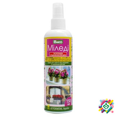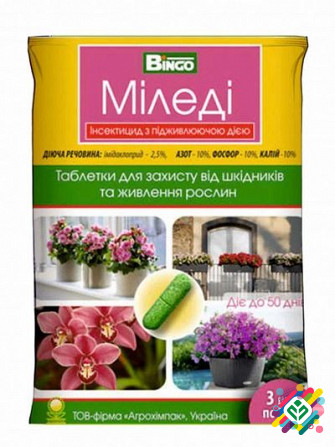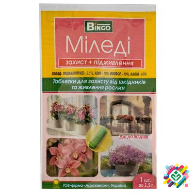 Мінімальна сума замовлення - 300 грн. **Міледі** - це контактно-системний інсектицид з підживлювальним дією для захисту кімнатних декоративних рослин закритого грунту від комплексу листогризучих та сисаючих шкідників. Ефективний проти білокрилки, щитівки, червеців, тли, клопів, цикадок, трипсів, тл...