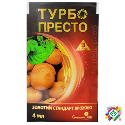 Мінімальна сума замовлення 300 грн. Інсектицид потрійної дії Турбо Престо 3 Актив для Сімейного саду є універсальним засобом, виготовленим на основі трьох діючих речовин, що застосовується для знищення жукарів та сисаючих комах на картоплі, помідорах, огірках, кукурудзі, горошку, яблуні, винограді ...