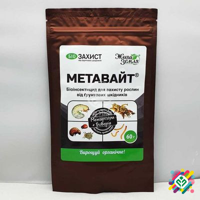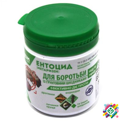 Мінімальна сума замовлення - 350 грн. Упаковка: 100 г, 400 г. Препарат для захисту рослин від ґрунтових шкідників. У складі препарату висока концентрація міцелію та спор гриба Metarhizium anisopliae, які є ентомопатогенними для ряду ґрунтових шкідливих комах. Біологічний ґрунтовий інсектицид, викори...