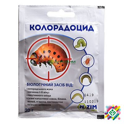 Мінімальна сума замовлення 350 грн. Новий унікальний біологічний засіб "Колорадоцид", 20 г - призначений для боротьби з колорадським жуком, павутинним кліщем, гусінцями капустяної молі, капустяної білої молі та багатьма іншими шкідниками. Діюча речовина: Спори культури Bacillus thuringiensis, титр...