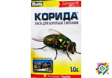 **Дезінфікуючий інсектицидний засіб "Корида" для боротьби з мухами та сліпняками** "Корида" - це дезінфікуючий інсектицидний засіб, який призначений для уничтоження мух та сліпнів у житлових, виробничих та громадських приміщеннях, а також всередині приміщень, де утримується домашня худоба та поруч ...