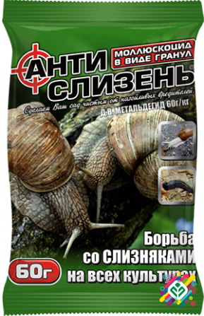 Мінімальна сума замовлення 350 грн. Упаковка: 20 г, 60 г, 300 г, 1 кг. Ефективний препарат для боротьби з слизнями на овочевих, ягідних, плодових, квіткових культурах, цитрусових, винограді та в підвальних приміщеннях (підвалах і т. п.). Діюча речовина: металдегід - 60 г/кг. Гранула. Застосування. ...
