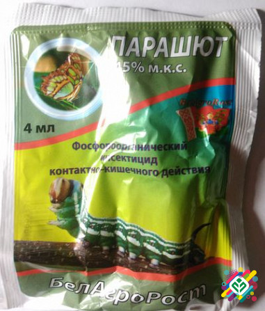 Мінімальна сума замовлення - 300 грн. Переваги інсектициду "Парашют": - тривалість токсичної дії на комах; - стійкість до інтенсивності сонячного випромінювання, температури та вологості повітря; - сумісність з іншими інсектицидами та фунгіцидами, добре змішується. Інсектицид добре переноситься ус...