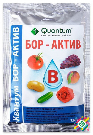 Мінімальна сума замовлення 350 грн Упаковка 30мл, 120мл Quantum Бор-Актив - концентрований борний мікродобрива, що містить бор у органічній формі. Використовується для листового підживлення с/г культур, чутливих до дефіциту бору (рапс, цукрова свекла, соняшник, виноград, овочі та інші). Благодаря а...