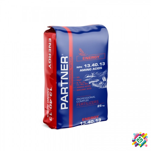 Комплексне добриво Партнер (Partner Energy) 13. 40. 13+АМК+ME, 25 кг Склад: N - 13%; P2O5 - 40%; K2O - 13%; S - 13%; MgO - 2,5%; B - 0,03%; Fe (EDTA) - 0,04%; Zn - 0,04%; Cu - 0,006%; Mo - 0,001%; Mn - 0,03%. Також містить 0,4% янтарної кислоти і 0,6% вільних амінокислот: ASP, THR, SER, GLU, PRO, ...