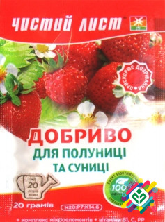 **Чистий Лист** - кристалічне добриво для полуниці та земляники, 20 г, є високоефективним, концентрованим, мінеральним добривом, що містить всі необхідні для живлення рослин елементи в легкодоступних формах. Це вітамінний комплекс, який покращує зовнішній вигляд рослин та стійкість до негативних умо...