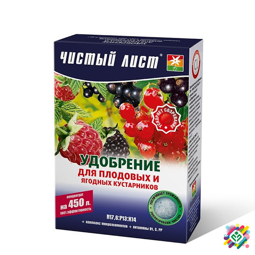 "Чистий лист" - це кристалічне удобрення для плодових та ягідних кущів (300 г), яке містить усі необхідні для рослин елементи у доступних формах. Це високоефективне, концентроване, мінеральне добриво, що сприяє покращенню врожайності, солодкості та розміру ягід, прискорює їх дозрівання та зменшує кі...