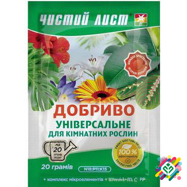 "Чистий Лист" - це кристалічне універсальне добриво для кімнатних рослин у формі упаковки по 20 г. Це високоефективне, концентроване мінеральне добриво, що містить всі необхідні для живлення рослин елементи у легкодоступних формах. Переваги: - Забезпечує високу якість плодів та квітів. - Усуває хло...