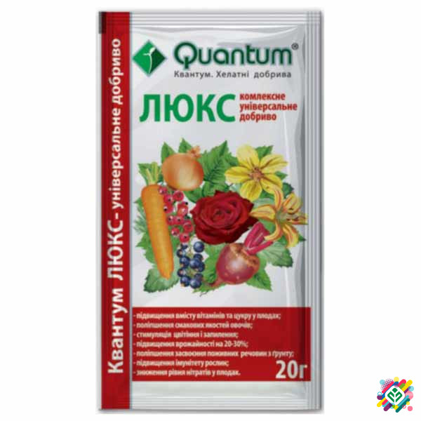 **Виробник:** Україна. **Склад:** макроелементи, мікроелементи в хелатній формі, амінокислоти, гумінові кислоти, фітогормони, прилипач. Вміст мікроелементів, г / л: Fe-12, Zn-7, Cu-7, Mn-7, B-4, Mo-0.1, Ni-0.1, Co-0.02. **Комплексне універсальне добриво "Квантум" ЛЮКС**. Внесення добрива гарантує...