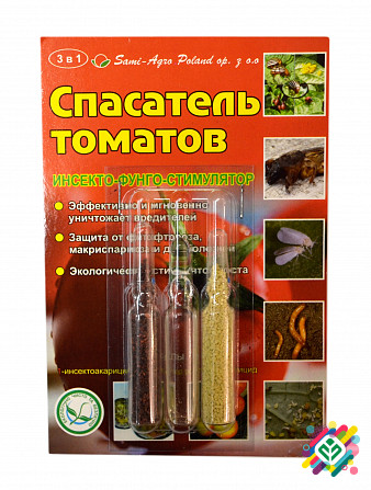 Препарат «Спасатель томатів» є високоефективним у боротьбі з усіма видами хвороб та більшістю комах-шкідників, які завдають серйозної шкоди сільському господарству. Препарат «Спасатель томатів» містить 3 ампули: - інсектоакарицид; - регулятор росту; - фунгіцид. Властивості препарату «Спасатель тома...