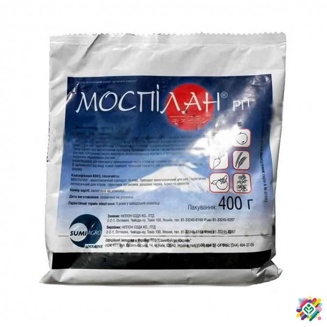 Фасовка 0.4 кг - 100 доларів за кг. Фасовка 0.05 кг - 98 доларів за кг. Системний інсектицид Моспилан має контактно-кишкову дію. Ацетаміприд (200 г/кг) - діюча речовина препарату. Виробник засобу - «Ніппон Сода Ко., Лтд.», Японія. Призначення інсектицида Моспилан Системний інсектицид з контактно-ш...