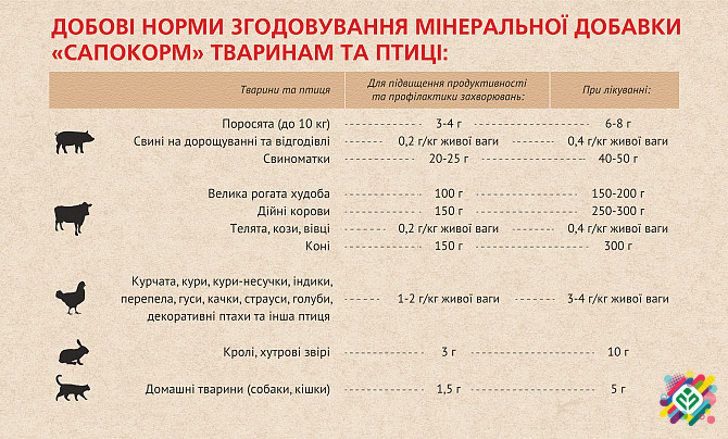 МІНЕРАЛЬНА ДОБАВКА ДО КОРМУ "КОРМОВИЙ САПОНІТ" "Кормовий сапоніт" є природною лікувально-профілактичною мінеральною добавкою, призначеною для використання у раціонах всіх видів тварин та птиці. "Кормовий сапоніт" виготовлений із природного дисперсного мінералу групи монтморилоніту триоктаедричного...