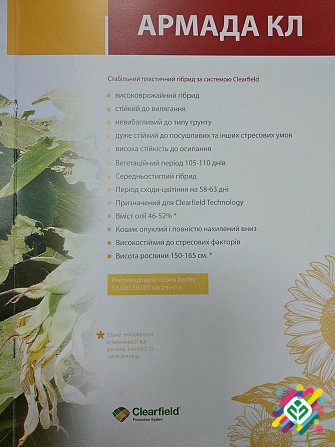 Семена подсолнечника Армада КЛ ООО «Инагротех» пропонує високоурожайний середньостиглий гібрид соняшнику під назвою Армада КЛ. Цей гібрид має наступні технічні характеристики, які можуть бути корисними для покупців: - Висока стійкість до зламу під вагою врожаю. - Не вибагливий до типу ґрунту. - Ст...
