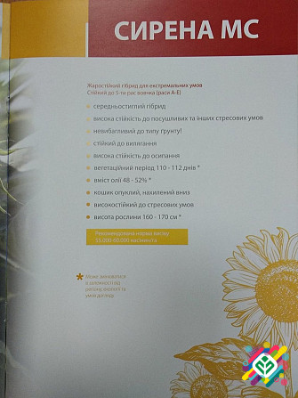 Семена подсолнечника Сирена МС: технічний опис та властивості Компанія ООО «Инагротех» пропонує наступні технічні характеристики семенів подсолнечника гібриду Сирена МС, який створений для вирощування в екстремальних умовах: 1. Висока стійкість до стресових умов: гібрид подсолнечника Сирена МС дем...