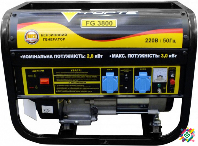 **Виробник**: Forte **Тип**: Бензиновий генератор **Максимальна потужність, кВт**: 3 **Номінальна потужність, кВт**: 2,8 **Тривалість автономної роботи, год**: 11 **Фаза**: 1 **Частота струму, Гц**: 50 **Номінальна напруга, В**: 230 **Двигун**: Forte FG3800 (43689) **Модель**: Fort...