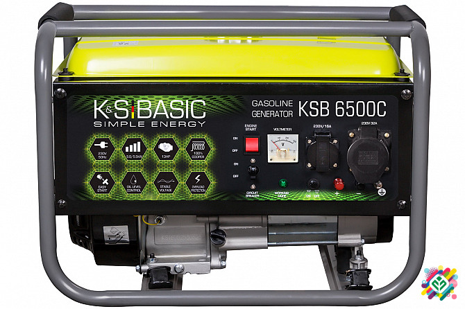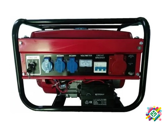 **Генератор електроенергії 4,8 кВт/6,5 к.с.** Напруга: 230 В - 380 В / 50 Гц, трифазна. Двигун: чотиритактний з повітряним охолодженням. Кількість розеток: 1x 380 В, 3x 230 В / 1x 12 В. Потужність двигуна: 4,8 кВт / 6,5 к.с. Максимальна потужність генератора: 2500 Вт. Постійна потужність генер...