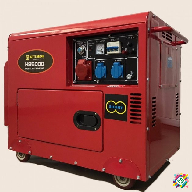 **Виробник:** Huttenberg **Тип електростанції:** Дизельний **Тип запуску:** Електричний запуск **Кількість фаз:** 3 **Розетки:** (2) 230 В; (1) 12 В **Тип установки:** Пересувні (на колесах) **Напруга, В:** 220 **Клас:** Побутовий **Максимальна потужність, кВт:** 6.5 **Призначення:...