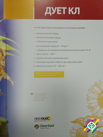Семена подсолнечника Дуэт КЛ ООО «Инагротех» радить вам ознайомитися з нашим продуктом - семенами подсолнечника Дуэт КЛ, що є раннеспелим гібридом. Вміст олії в цих насіннях становить 47-50%. Вегетаційний період соняшника Дуэт КЛ триває 91-94 дні, а висота рослин коливається від 145 до 165 см. Крі...