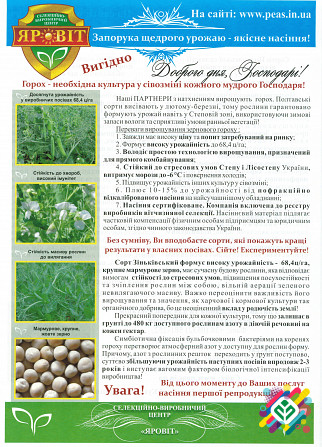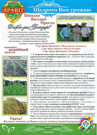 Пропонуємо насіння репродукції та еліти ультраскоростиглого сорту проса "Полтавське золотисте". Це насіння має округлу форму, бронзове забарвлення та глянцеву поверхню. Сорт є ультраранньостиглим, при сприятливих умовах досягає стиглості за 50-60 сонячних днів. Він має високу стійкість до вилягання,...