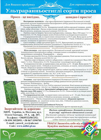 Сорт Полтавське золотисте (просо посівне), Еліта Репродукція посадкового матеріалу: Еліта Фракція насіння: Екстра Насіння ультраскоростиглого проса сорту Полтавське золотисте є відмінним вибором для сівозміни та отримання високоякісного врожаю. Зернівка цього сорту має округлу форму, бронзове заба...