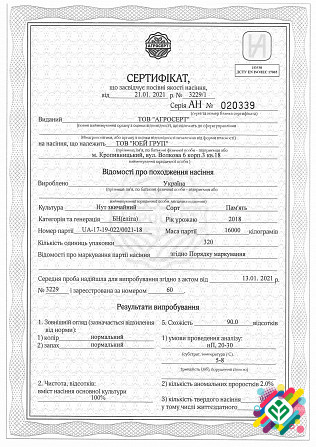 Соя «Діона» - це виділений сорт посівного матеріалу, що представлений у двох категоріях: "Еліта" (27000 грн) та "Перша репродукція" (25000 грн). Цей сорт внесено до «Державного Реєстру сортів рослин України» та рекомендовано для вирощування у всіх кліматичних зонах. Морфологічна та біологічна харак...