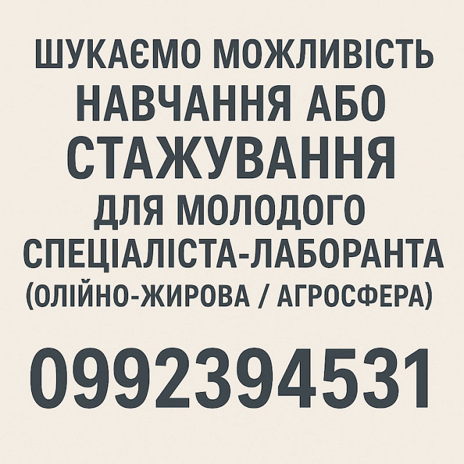 Шукаємо можливість навчання або стажування для молодого спеціаліста-лаборанта (олійно-жирова / агросфера) Є відповідальна, уважна та вмотивована дівчина, яка прагне розвиватися у напрямку контролю якості насіння, макухи, олії та супутніх продуктів переробки. Шукаємо агропідприємство або лабораторі...
