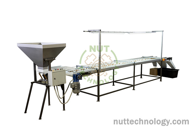 Інспекційний стіл призначений для сортування ядра волоського горіха від шкаралупи, сміття і дрібних частинок. Стіл здатний забезпечити роботою від 8 перебиральників, в залежності від вимог замовника. Інспекційний стіл застосовується в промисловій переробці горіха, з великими об’ємами сировини. Устат...
