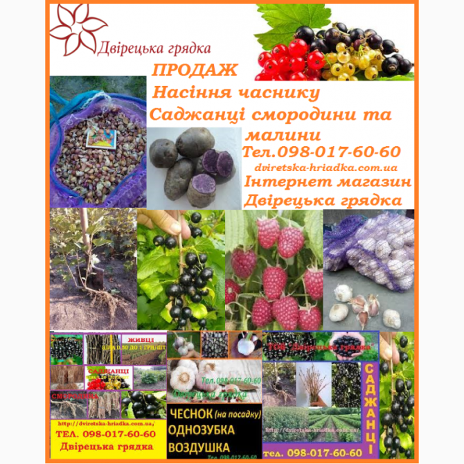 Предприятие "Двірецька грядка" специализируется на реализации саженцев и черенков смородины для посадки черных сортов: "Киевский Великан", "Титания", "Красота Львова", "Бен Алдер", "Бен Ломонд", "Тибен", "Юбилейная Копаня" первого сорта, без заболеваний, только отборные экземпляры. Качество и сохран...