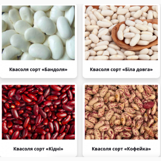 Продаємо різноманітні сорти квасолі, серед яких: Бандоля, Біла довга, Шоколадниця, Біла кругла, Кідні, Кофейка, Ластівка, Ліма, Мавка, Неві, Пінто, Рубін, Солдатик, Томатка, Фава, Чалі, Чорна дрібна та інші. Наші продукти відзначаються високою якістю та є повністю натуральними та екологічно чистими....