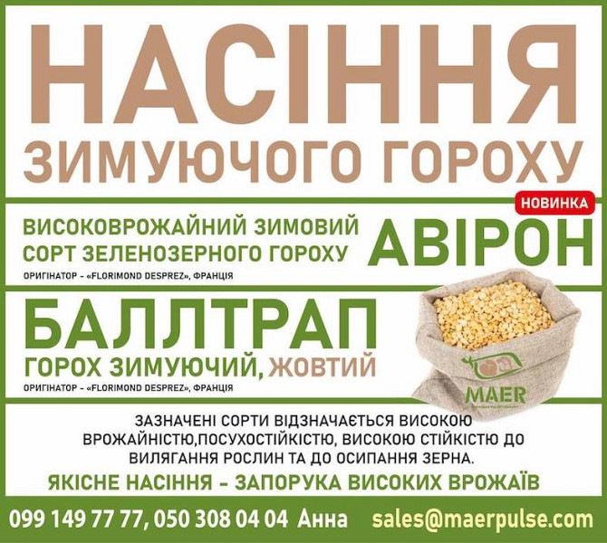 **Технічний опис високоякісного насіння озимого гороху** Наша компанія рада представити вам високоякісне насіння озимого гороху двох сортів: «Горох зимуючий зелений Авірон» та «Горох озимий жовтий Баллтрап». **Характеристики продукту:** 1. **Горох зимуючий зелений Авірон:** - Рекомендований дл...