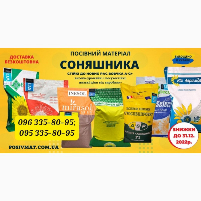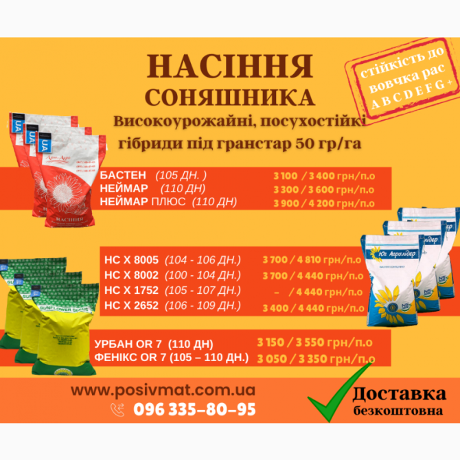 **Акція: Насіння соняшнику УРБАН OR7+, ФЕНІКС OR7+, КАРАТ, ФОРЕСТ, БАРСА, НЕО, ГРАНД АДМІРАЛ** При покупці 5 посівних одиниць насіння соняшника, отримайте в подарунок одну банку гербіциду аналогу ГРАНСТАРУ (діюча речовина - трибенурол-метин 750 г/кг - 0,5 кг). Деталі у менеджерів компанії за номеро...