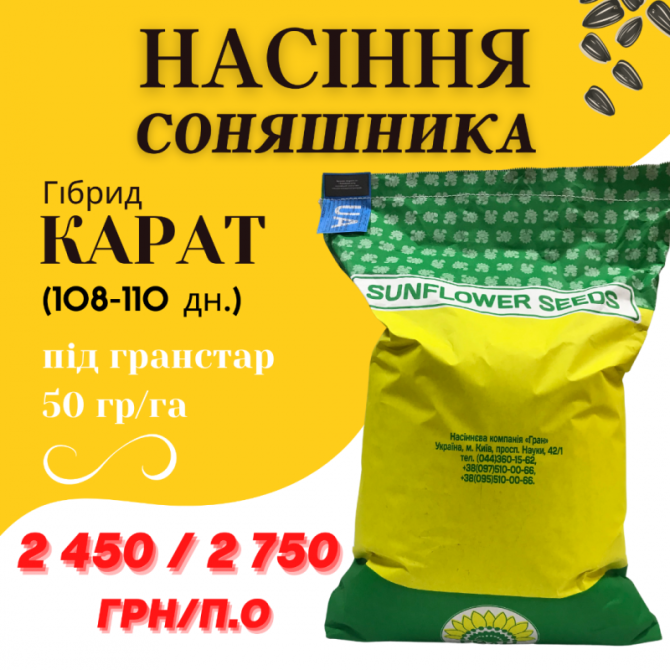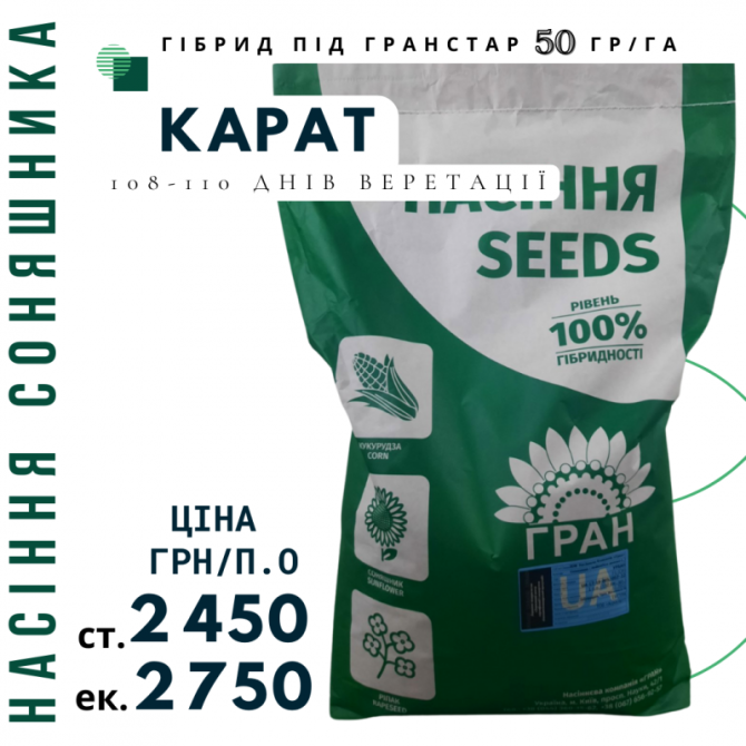 ГІБРИДНЕ НАСІННЯ СОНЯШНИКА "КАРАТ" ВІД УКРАЇНСЬКОЇ СЕЛЕКЦІЇ НК «ГРАН» Гібрид "Карат" є високоврожайним сортом соняшнику, розробленим українським селекціонерським підприємством НК «Гран». Цей гібрид відзначається високою стійкістю до хвороб і стресових умов, що робить його ідеальним вибором для сіль...