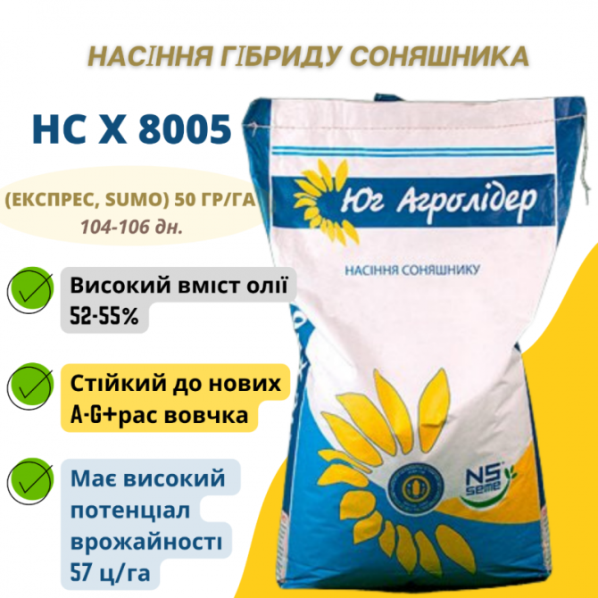 Насіння гібриду соняшника НС Х 8005 є продуктом нового покоління від сербської селекції, спеціально адаптованим для українських ґрунтових умов та погодних умов, коли використовується технологія SUMO. Цей гібрид відноситься до олійних гібридів екстенсивного типу і має високий генетичний потенціал вро...