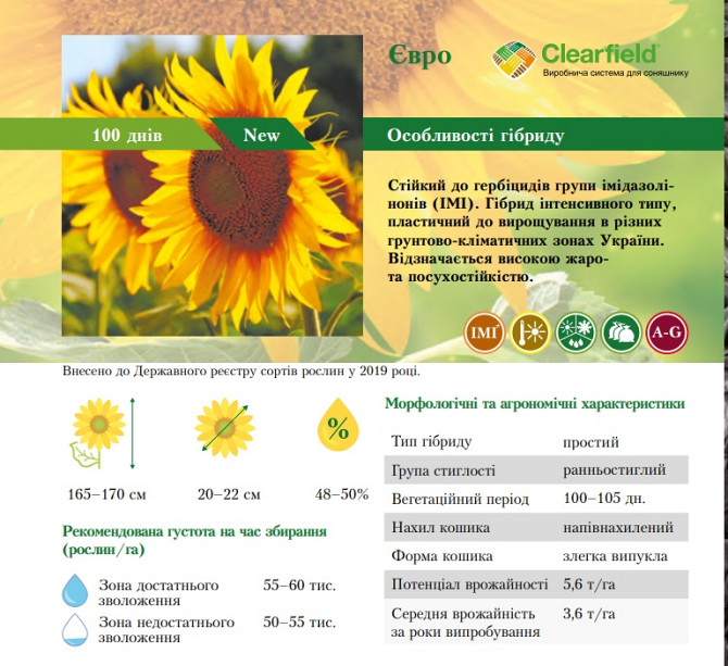 Гібрид соняшнику "Євро" — це ранньостиглий Clearfield гібрид інтенсивного типу, спеціально створений для вирощування у різних грунтових та кліматичних умовах України. Цей гібрид відрізняється високою термічною та посухостійкістю, що робить його відмінним вибором для українських фермерів. "Євро" має...
