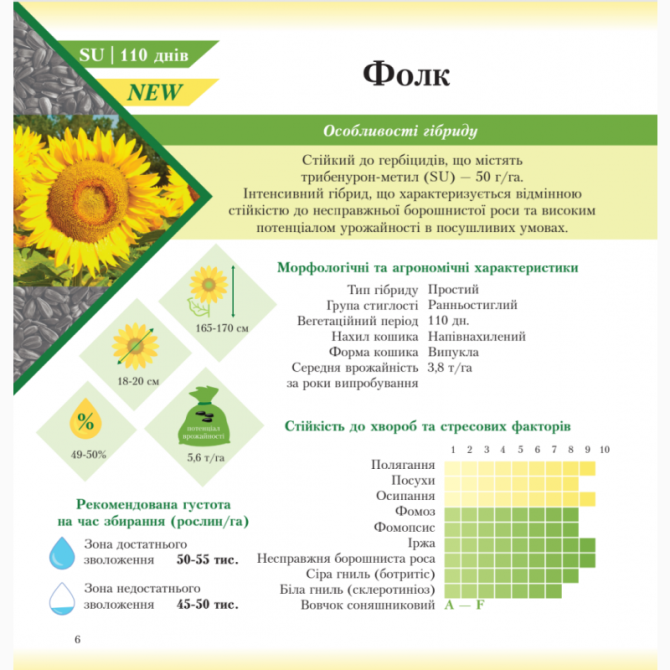 Гібриди соняшнику Фолк Екстра 2020 та Фолк Стандарт 2020 представляють нові сорти в лінійці гібридів соняшнику від селекційного центру ВНІС. Їх відмінністю є стійкість до дії догербіцидів, що містять трибенурон-метил (SU) у концентрації 50 г/га. Гібриди Фолк відзначаються високою стійкістю до несп...