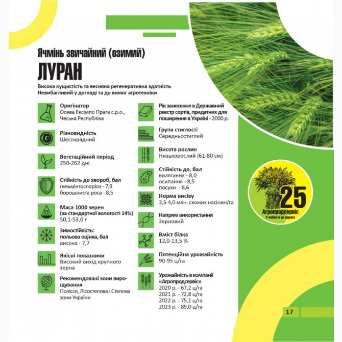 Насіння сорту ЛУРАН Наша компанія пропонує високоякісне насіння сорту ЛУРАН, яке відповідає вимогам сортового та посівного сертифікатів якості. Насіння фасується у біги по 1 тонні, що забезпечує зручність та ефективність його транспортування та зберігання. Технічна інформація про насіння сорту ЛУ...
