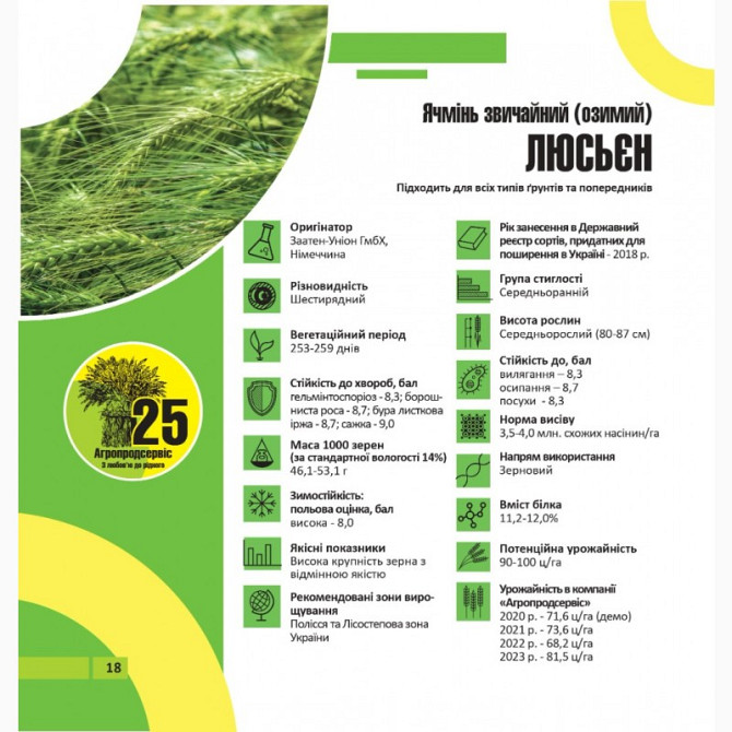 Насіння сорту ЛЮСЬЄН є високоякісним продуктом, який відповідає усім стандартам якості. Кожна партія насіння супроводжується сортовим і посівним сертифікатами, що підтверджують його походження та якість. Технічна інформація: - Сорт: ЛЮСЬЄН - Упаковка: біг-беги по 1 тонні - Сертифікати: сортовий і ...
