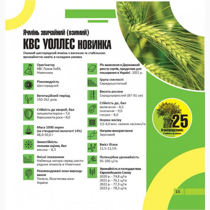 Це опис технічних характеристик середньопізнього шестирядного озимого ячменю інтенсивного типу, що відрізняється хорошим кущінням та придатний для вирощування у всіх зонах України. **Основні характеристики:** - **Оригінатор:** Selgen, Чехія - **Вегетаційний період:** 262 дні - **Висота рослини:** ...
