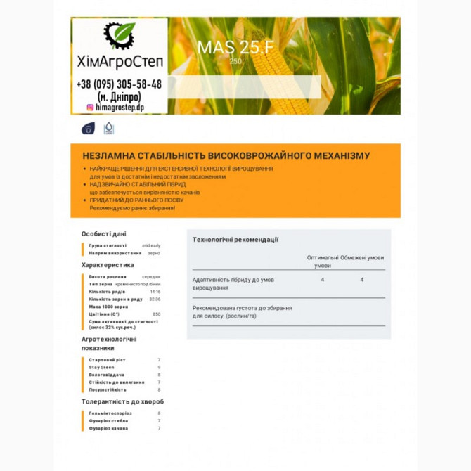 **Насіння кукурудзи "Mas25.F" (ФАО 250)** Улюбленець агрономів — фантастична врожайність на зернових полях України. Лідер за урожайністю зеленої маси для силосування. "Mas25.F" — найвищий гібрид в українському портфоліо кукурудзи, відзначається високою вологовіддачею та стійкістю до основних хвороб...