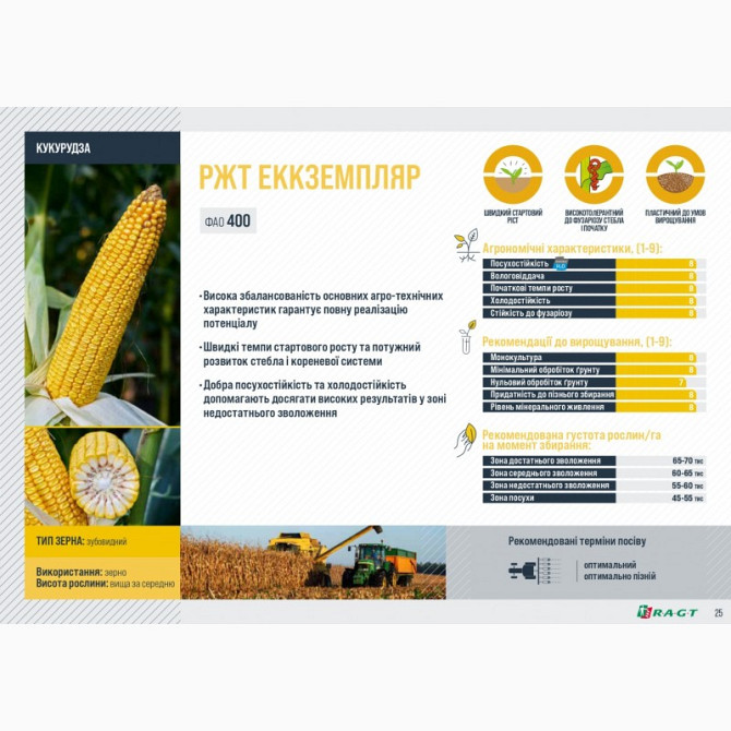 **Опис гібриду кукурудзи РЖТ ЕККЗЕМПЛЯР** Кукурудза РЖТ ЕККЗЕМПЛЯР є середньопізнім гібридом з високою збалансованістю основних агро-технічних характеристик, що гарантує повну реалізацію потенціалу рослини. Цей гібрид відзначається швидким стартовим ростом, потужним розвитком стебла і кореневої сис...