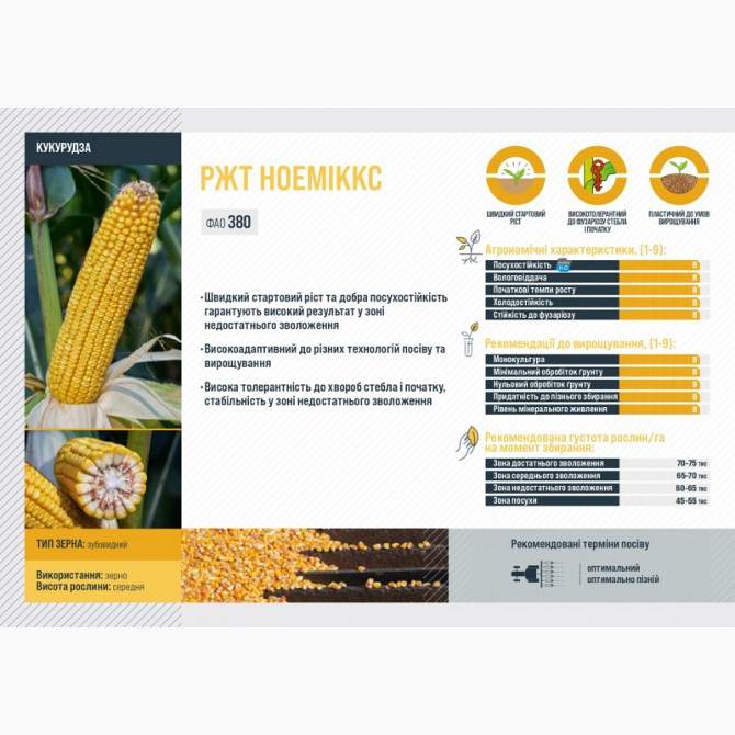 **Генетично модифікована кукурудза НОЕМІКС** *Тип використання:* Зерно *Група стиглості:* Середньостигла *FAO:* 380 Генетично модифікована кукурудза НОЕМІКС відома своїм швидким стартовим ростом та відмінною посухостійкістю, що гарантує високі врожаї в умовах недостатнього зволоження. Цей сорт...